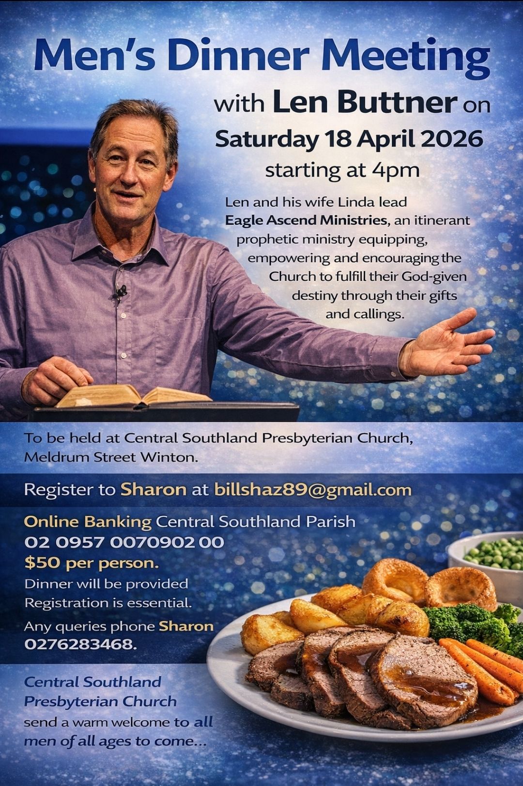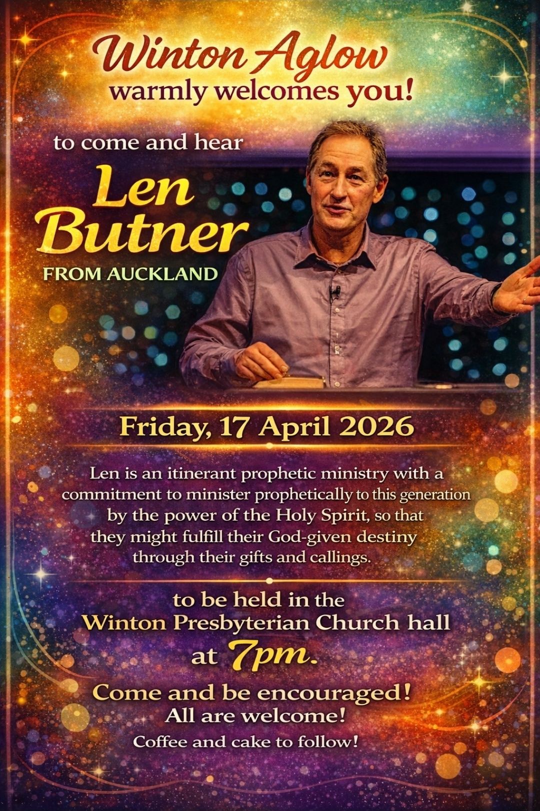Winton Aglow warmly invites you to an evening of encouragement, ministry, and fellowship as we welcome Len Butner from Auckland. Len carries an itinerant prophetic ministry with a heart to strengthen and equip this generation through the power of the Holy Spirit. His focus is to help believers step into their God‑given destiny, gifts, and […]